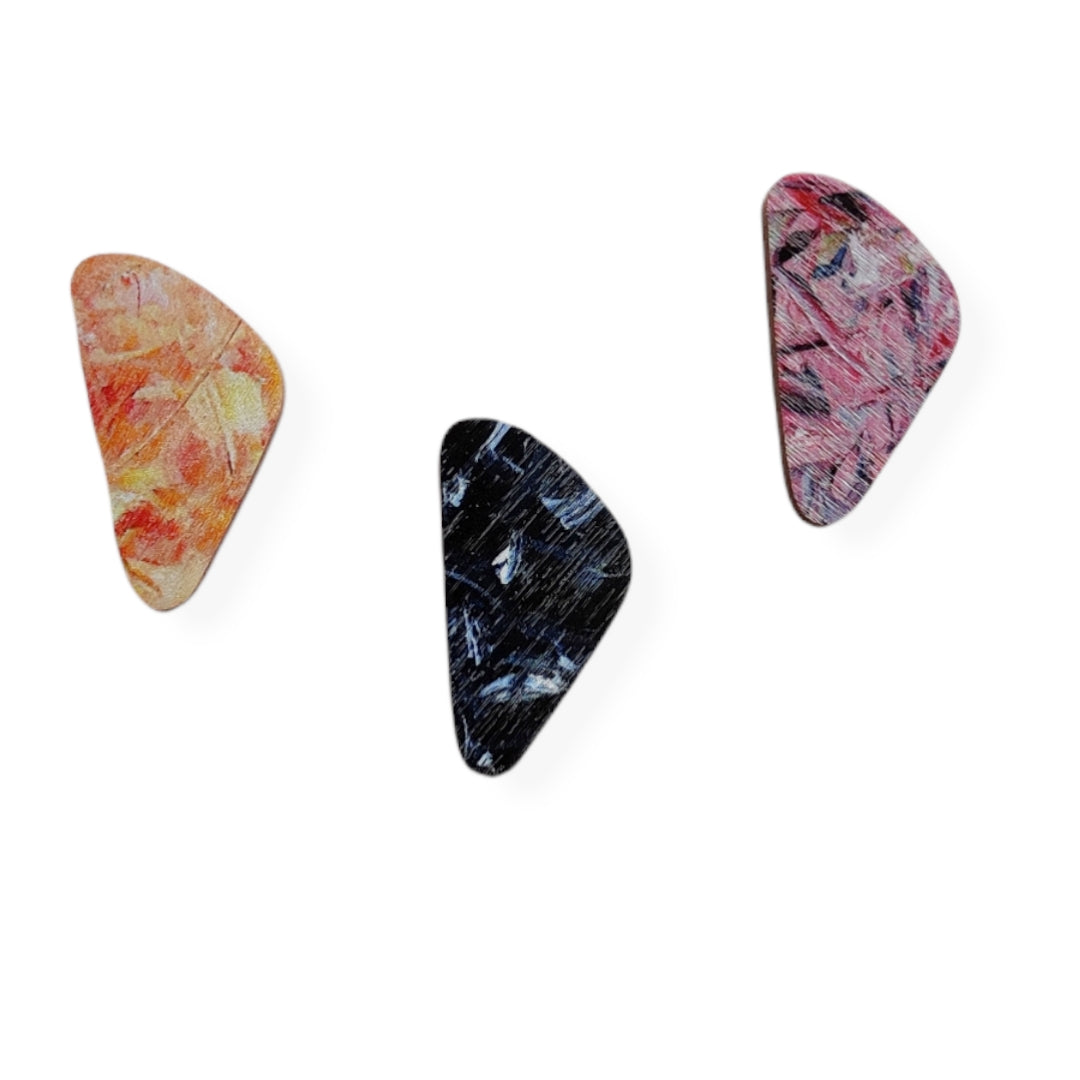 This collection has been made in collaboration with visual artist Tuuli Oikkonen. Oikkonen's paintings come to life in Törmi's jewelry in a new way. The jewelry is made of Finnish birch and hypoallergenic steel.